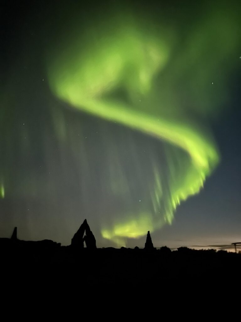 The best time to view the Northern Lights in Iceland is during the winter season when the nights are at their darkest. Typically, from September through mid-April, I have witnessed intense aurora activity!